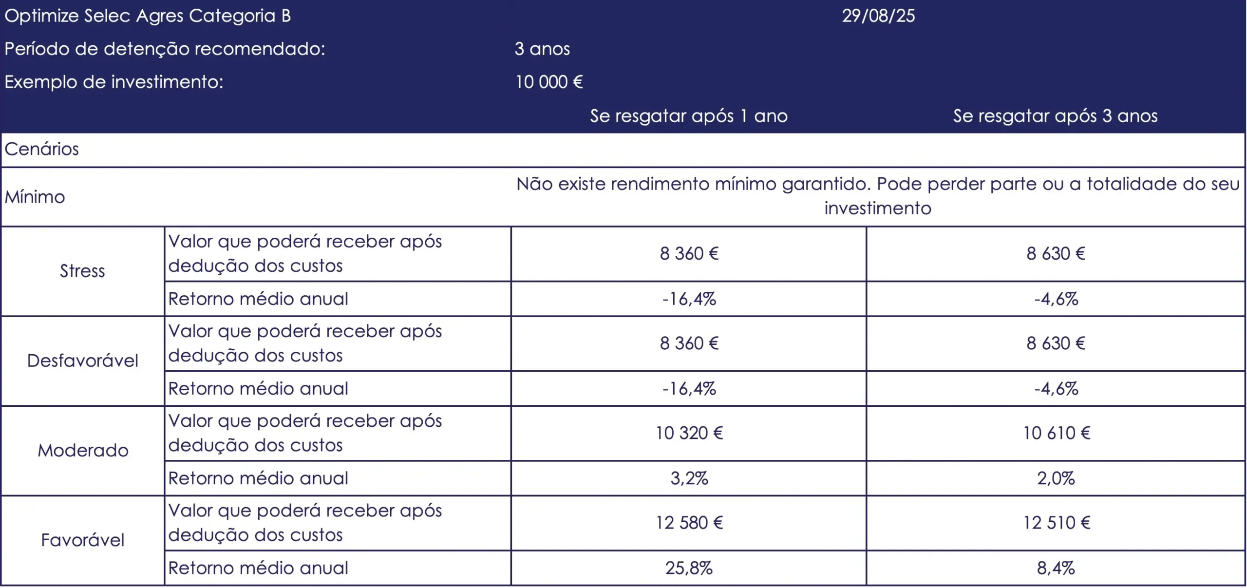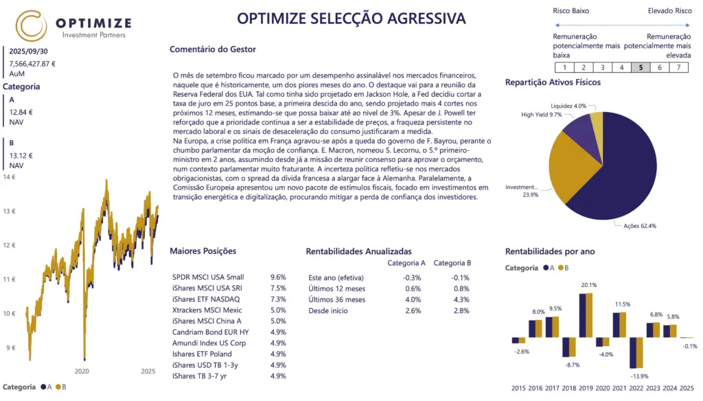 As rentabilidades divulgadas representam dados passados e não constituem uma garantia de rentabilidade futura. O valor das unidades de participação pode aumentar ou diminuir em função do nível de risco que varia entre 1 (risco mínimo) e 7 (risco máximo). Os fundos geridos pela Optimize Investimento são fundos de investimento mobiliário, cujos prospetos completos e IFI se encontram disponíveis nas entidades comercializadoras. As taxas de rentabilidade mencionadas são líquidas de comissão de gestão e de depósito, de custos de auditoria e de taxa de supervisão. Os valores divulgados têm implícita a fiscalidade suportada pelo organismo de investimento coletivo e impende sobre o investidor o eventual pagamento de impostos sobre as mais-valias. O investimento no organismo de investimento coletivo pode implicar a perda do capital investido. As medidas de rentabilidade divulgadas só seriam obtidas se o investimento fosse efetuado durante a totalidade do período de referência e têm em conta o valor da UP a 30-09-2025.