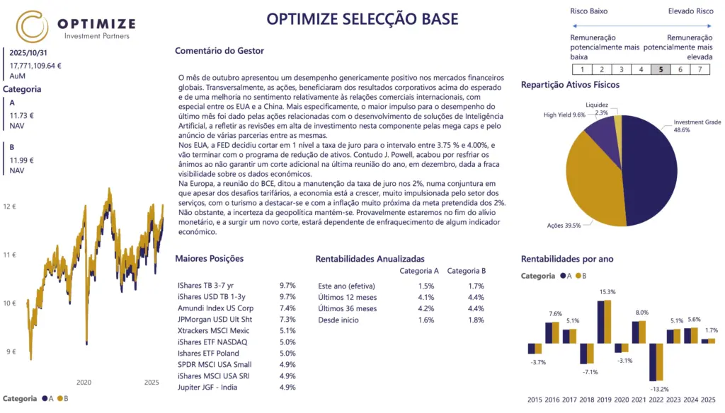 As rentabilidades divulgadas representam dados passados e não constituem uma garantia de rentabilidade futura. O valor das unidades de participação pode aumentar ou diminuir em função do nível de risco que varia entre 1 (risco mínimo) e 7 (risco máximo). Os fundos geridos pela Optimize Investimento são fundos de investimento mobiliário, cujos prospetos completos e IFI se encontram disponíveis nas entidades comercializadoras. As taxas de rentabilidade mencionadas são líquidas de comissão de gestão e de depósito, de custos de auditoria e de taxa de supervisão. Os valores divulgados têm implícita a fiscalidade suportada pelo organismo de investimento coletivo e impende sobre o investidor o eventual pagamento de impostos sobre as mais-valias. O investimento no organismo de investimento coletivo pode implicar a perda do capital investido. As medidas de rentabilidade divulgadas só seriam obtidas se o investimento fosse efetuado durante a totalidade do período de referência e têm em conta o valor da UP a 30-09-2025.