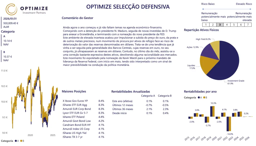 As rentabilidades divulgadas representam dados passados e não constituem uma garantia de rentabilidade futura. O valor das unidades de participação pode aumentar ou diminuir em função do nível de risco que varia entre 1 (risco mínimo) e 7 (risco máximo). Os fundos geridos pela Optimize Investimento são fundos de investimento mobiliário, cujos prospetos completos e IFI se encontram disponíveis nas entidades comercializadoras. As taxas de rentabilidade mencionadas são líquidas de comissão de gestão e de depósito, de custos de auditoria e de taxa de supervisão. Os valores divulgados têm implícita a fiscalidade suportada pelo organismo de investimento coletivo e impende sobre o investidor o eventual pagamento de impostos sobre as mais-valias. O investimento no organismo de investimento coletivo pode implicar a perda do capital investido. As medidas de rentabilidade divulgadas só seriam obtidas se o investimento fosse efetuado durante a totalidade do período de referência e têm em conta o valor da UP a 31-12-2025.