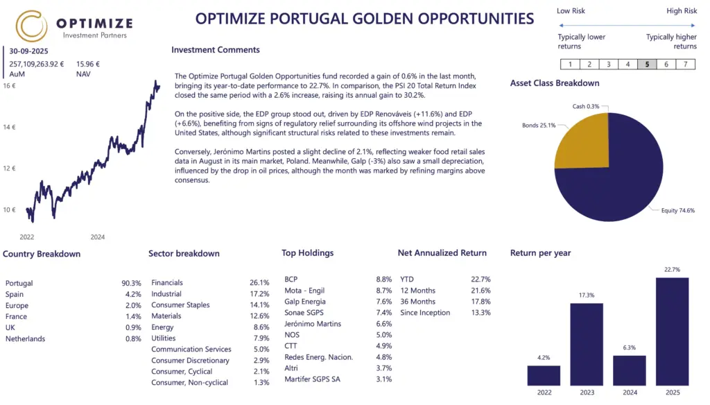 The fund aims to provide participants with long-term investment appreciation, by investing in a portfolio that has between 80% to 100% exposure to Portuguese domiciliated companies. The fund does not have any exposure to real estate.
