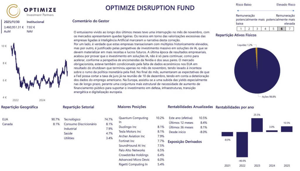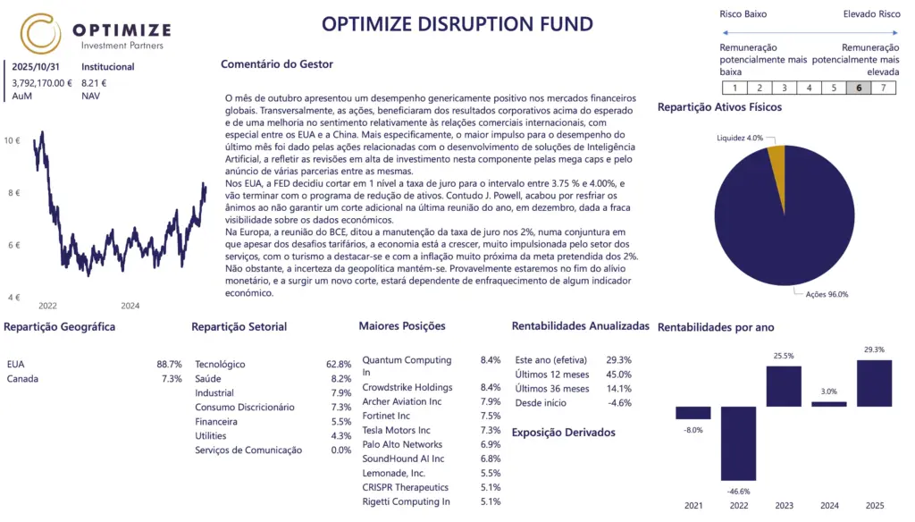 As rentabilidades divulgadas representam dados passados e não constituem uma garantia de rentabilidade futura. O valor das unidades de participação pode aumentar ou diminuir em função do nível de risco que varia entre 1 (risco mínimo) e 7 (risco máximo). Os fundos geridos pela Optimize Investimento são fundos de investimento mobiliário, cujos prospetos completos e IFI se encontram disponíveis nas entidades comercializadoras. As taxas de rentabilidade mencionadas são líquidas de comissão de gestão e de depósito, de custos de auditoria e de taxa de supervisão. Os valores divulgados têm implícita a fiscalidade suportada pelo organismo de investimento coletivo e impende sobre o investidor o eventual pagamento de impostos sobre as mais-valias. O investimento no organismo de investimento coletivo pode implicar a perda do capital investido. As medidas de rentabilidade divulgadas só seriam obtidas se o investimento fosse efetuado durante a totalidade do período de referência e têm em conta o valor da UP a 30-09-2025.