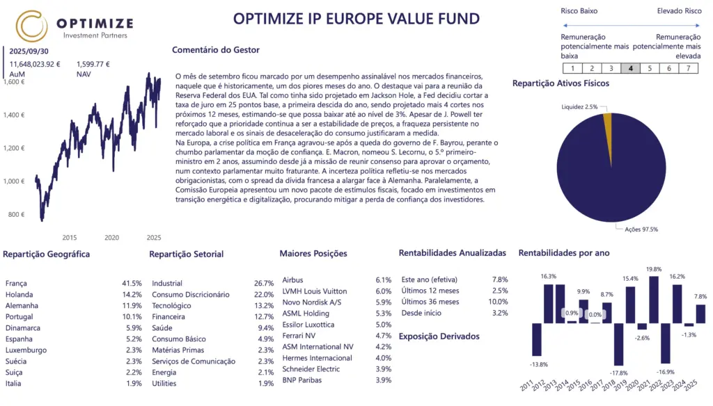 As rentabilidades divulgadas representam dados passados e não constituem uma garantia de rentabilidade futura. O valor das unidades de participação pode aumentar ou diminuir em função do nível de risco que varia entre 1 (risco mínimo) e 7 (risco máximo). Os fundos geridos pela Optimize Investimento são fundos de investimento mobiliário, cujos prospetos completos e IFI se encontram disponíveis nas entidades comercializadoras. As taxas de rentabilidade mencionadas são líquidas de comissão de gestão e de depósito, de custos de auditoria e de taxa de supervisão. Os valores divulgados têm implícita a fiscalidade suportada pelo organismo de investimento coletivo e impende sobre o investidor o eventual pagamento de impostos sobre as mais-valias. O investimento no organismo de investimento coletivo pode implicar a perda do capital investido. As medidas de rentabilidade divulgadas só seriam obtidas se o investimento fosse efetuado durante a totalidade do período de referência e têm em conta o valor da UP a 30-09-2025.