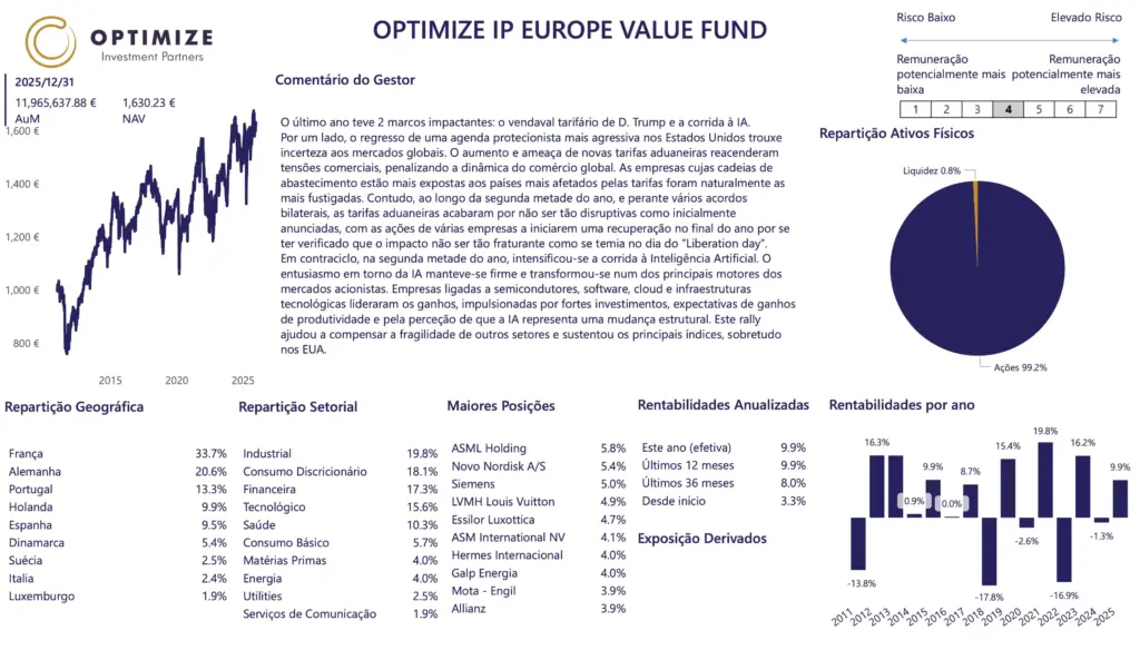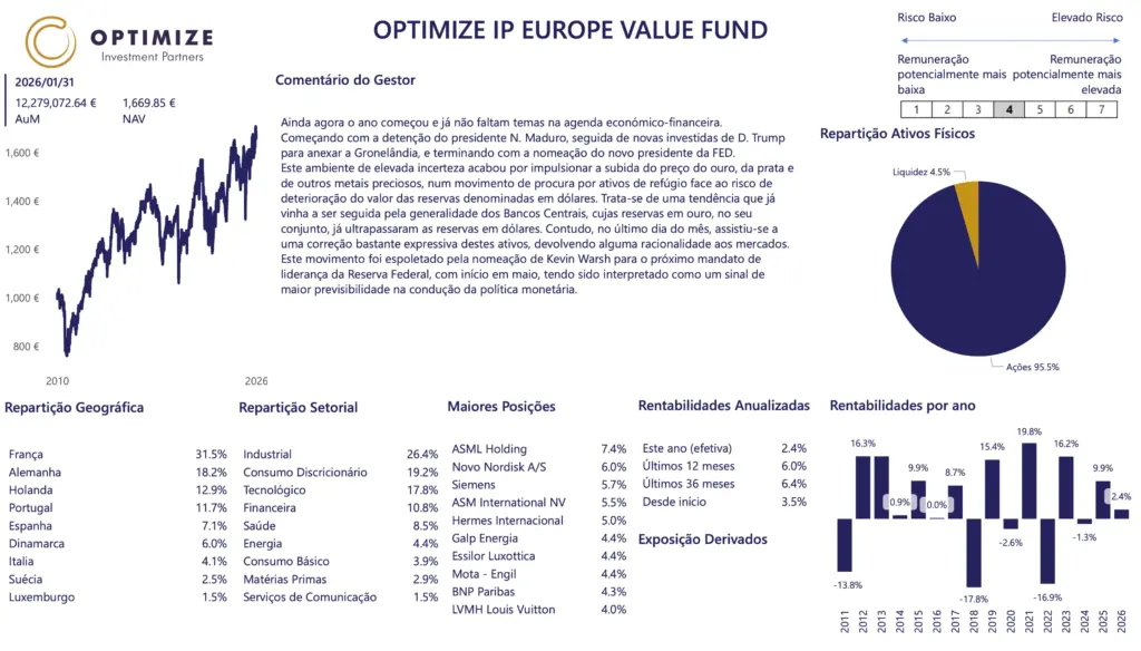 As rentabilidades divulgadas representam dados passados e não constituem uma garantia de rentabilidade futura. O valor das unidades de participação pode aumentar ou diminuir em função do nível de risco que varia entre 1 (risco mínimo) e 7 (risco máximo). Os fundos geridos pela Optimize Investimento são fundos de investimento mobiliário, cujos prospetos completos e IFI se encontram disponíveis nas entidades comercializadoras. As taxas de rentabilidade mencionadas são líquidas de comissão de gestão e de depósito, de custos de auditoria e de taxa de supervisão. Os valores divulgados têm implícita a fiscalidade suportada pelo organismo de investimento coletivo e impende sobre o investidor o eventual pagamento de impostos sobre as mais-valias. O investimento no organismo de investimento coletivo pode implicar a perda do capital investido. As medidas de rentabilidade divulgadas só seriam obtidas se o investimento fosse efetuado durante a totalidade do período de referência e têm em conta o valor da UP a 31-12-2025.