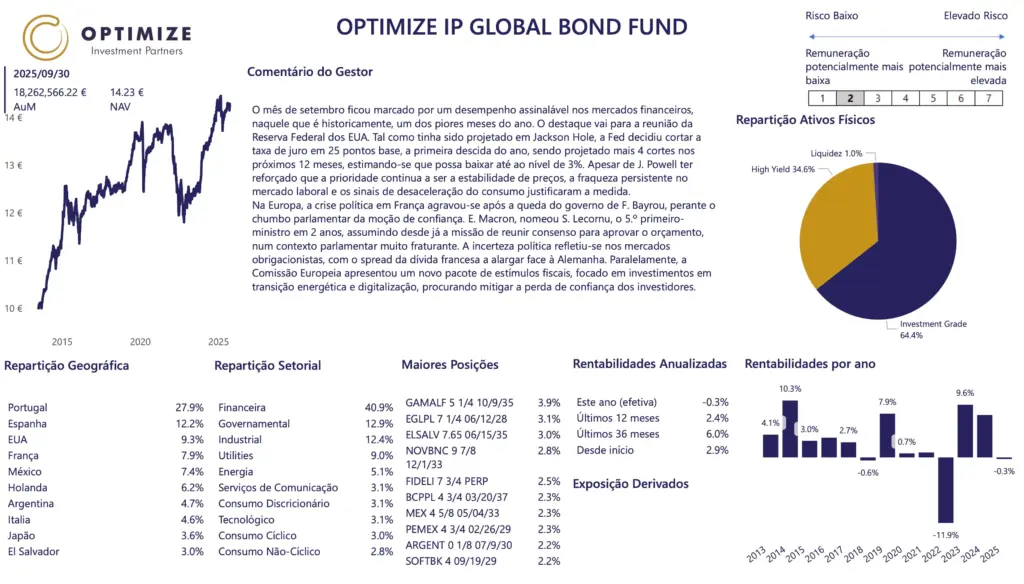 As rentabilidades divulgadas representam dados passados e não constituem uma garantia de rentabilidade futura. O valor das unidades de participação pode aumentar ou diminuir em função do nível de risco que varia entre 1 (risco mínimo) e 7 (risco máximo). Os fundos geridos pela Optimize Investimento são fundos de investimento mobiliário, cujos prospetos completos e IFI se encontram disponíveis nas entidades comercializadoras. As taxas de rentabilidade mencionadas são líquidas de comissão de gestão e de depósito, de custos de auditoria e de taxa de supervisão. Os valores divulgados têm implícita a fiscalidade suportada pelo organismo de investimento coletivo e impende sobre o investidor o eventual pagamento de impostos sobre as mais-valias. O investimento no organismo de investimento coletivo pode implicar a perda do capital investido. As medidas de rentabilidade divulgadas só seriam obtidas se o investimento fosse efetuado durante a totalidade do período de referência e têm em conta o valor da UP a 30-09-2025.