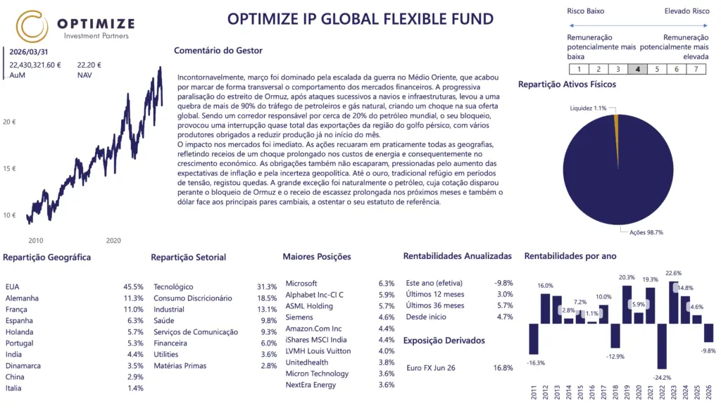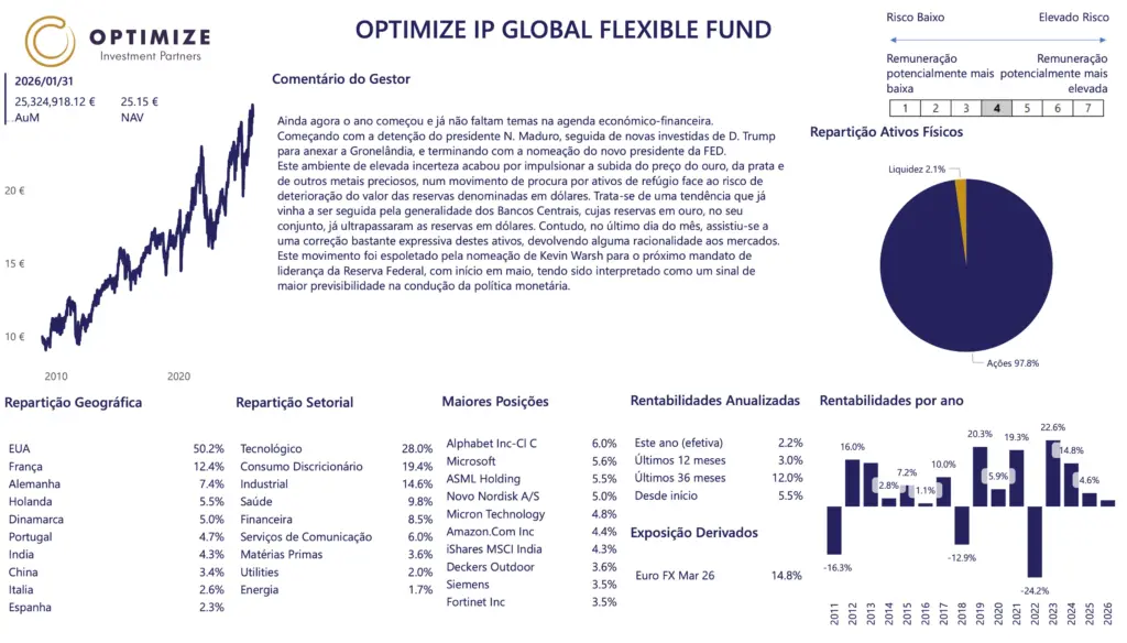 As rentabilidades divulgadas representam dados passados e não constituem uma garantia de rentabilidade futura. O valor das unidades de participação pode aumentar ou diminuir em função do nível de risco que varia entre 1 (risco mínimo) e 7 (risco máximo). Os fundos geridos pela Optimize Investimento são fundos de investimento mobiliário, cujos prospetos completos e IFI se encontram disponíveis nas entidades comercializadoras. As taxas de rentabilidade mencionadas são líquidas de comissão de gestão e de depósito, de custos de auditoria e de taxa de supervisão. Os valores divulgados têm implícita a fiscalidade suportada pelo organismo de investimento coletivo e impende sobre o investidor o eventual pagamento de impostos sobre as mais-valias. O investimento no organismo de investimento coletivo pode implicar a perda do capital investido. As medidas de rentabilidade divulgadas só seriam obtidas se o investimento fosse efetuado durante a totalidade do período de referência e têm em conta o valor da UP a 31-12-2025.