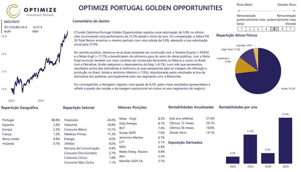 As rentabilidades divulgadas representam dados passados e não constituem uma garantia de rentabilidade futura. O valor das unidades de participação pode aumentar ou diminuir em função do nível de risco que varia entre 1 (risco mínimo) e 7 (risco máximo). Os fundos geridos pela Optimize Investimento são fundos de investimento mobiliário, cujos prospetos completos e IFI se encontram disponíveis nas entidades comercializadoras. As taxas de rentabilidade mencionadas são líquidas de comissão de gestão e de depósito, de custos de auditoria e de taxa de supervisão. Os valores divulgados têm implícita a fiscalidade suportada pelo organismo de investimento coletivo e impende sobre o investidor o eventual pagamento de impostos sobre as mais-valias. O investimento no organismo de investimento coletivo pode implicar a perda do capital investido. As medidas de rentabilidade divulgadas só seriam obtidas se o investimento fosse efetuado durante a totalidade do período de referência e têm em conta o valor da UP a 30-09-2025.