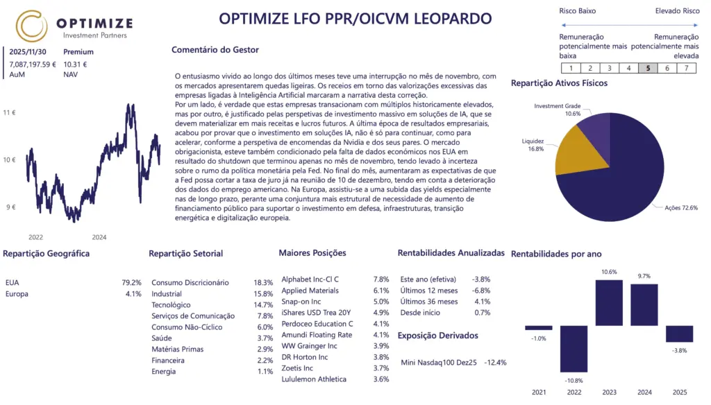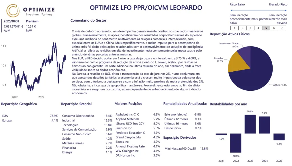 As rentabilidades divulgadas representam dados passados e não constituem uma garantia de rentabilidade futura. O valor das unidades de participação pode aumentar ou diminuir em função do nível de risco que varia entre 1 (risco mínimo) e 7 (risco máximo). Os fundos geridos pela Optimize Investimento são fundos de investimento mobiliário, cujos prospetos completos e IFI se encontram disponíveis nas entidades comercializadoras. As taxas de rentabilidade mencionadas são líquidas de comissão de gestão e de depósito, de custos de auditoria e de taxa de supervisão. Os valores divulgados têm implícita a fiscalidade suportada pelo organismo de investimento coletivo e impende sobre o investidor o eventual pagamento de impostos sobre as mais-valias. O investimento no organismo de investimento coletivo pode implicar a perda do capital investido. As medidas de rentabilidade divulgadas só seriam obtidas se o investimento fosse efetuado durante a totalidade do período de referência e têm em conta o valor da UP a 30-09-2025.