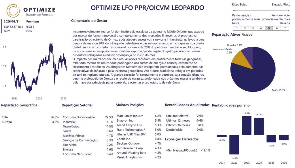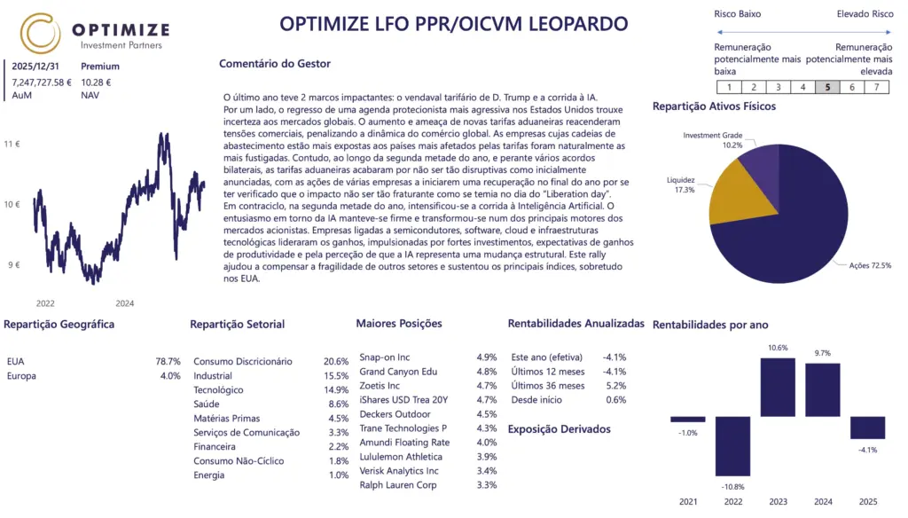 As rentabilidades divulgadas representam dados passados e não constituem uma garantia de rentabilidade futura. O valor das unidades de participação pode aumentar ou diminuir em função do nível de risco que varia entre 1 (risco mínimo) e 7 (risco máximo). Os fundos geridos pela Optimize Investimento são fundos de investimento mobiliário, cujos prospetos completos e IFI se encontram disponíveis nas entidades comercializadoras. As taxas de rentabilidade mencionadas são líquidas de comissão de gestão e de depósito, de custos de auditoria e de taxa de supervisão. Os valores divulgados têm implícita a fiscalidade suportada pelo organismo de investimento coletivo e impende sobre o investidor o eventual pagamento de impostos sobre as mais-valias. O investimento no organismo de investimento coletivo pode implicar a perda do capital investido. As medidas de rentabilidade divulgadas só seriam obtidas se o investimento fosse efetuado durante a totalidade do período de referência e têm em conta o valor da UP a 31-12-2025.