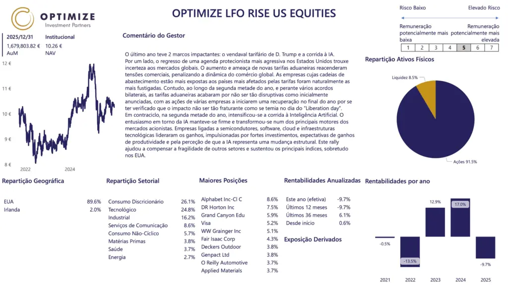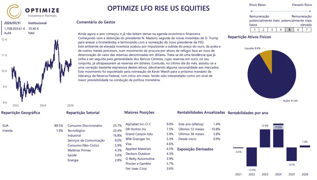 As rentabilidades divulgadas representam dados passados e não constituem uma garantia de rentabilidade futura. O valor das unidades de participação pode aumentar ou diminuir em função do nível de risco que varia entre 1 (risco mínimo) e 7 (risco máximo). Os fundos geridos pela Optimize Investimento são fundos de investimento mobiliário, cujos prospetos completos e IFI se encontram disponíveis nas entidades comercializadoras. As taxas de rentabilidade mencionadas são líquidas de comissão de gestão e de depósito, de custos de auditoria e de taxa de supervisão. Os valores divulgados têm implícita a fiscalidade suportada pelo organismo de investimento coletivo e impende sobre o investidor o eventual pagamento de impostos sobre as mais-valias. O investimento no organismo de investimento coletivo pode implicar a perda do capital investido. As medidas de rentabilidade divulgadas só seriam obtidas se o investimento fosse efetuado durante a totalidade do período de referência e têm em conta o valor da UP a 31-12-2025.