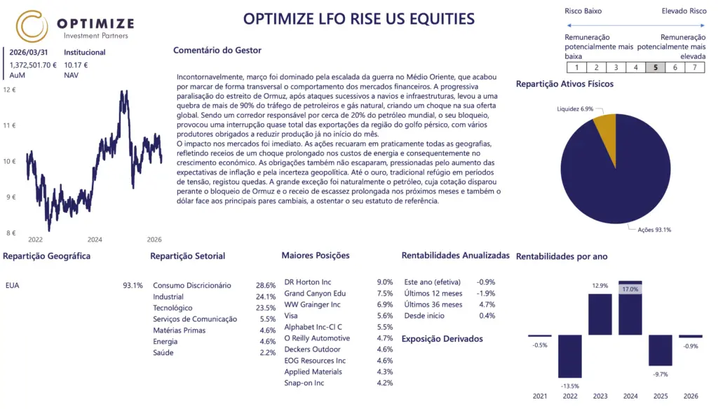As rentabilidades divulgadas representam dados passados e não constituem uma garantia de rentabilidade futura. O valor das unidades de participação pode aumentar ou diminuir em função do nível de risco que varia entre 1 (risco mínimo) e 7 (risco máximo). Os fundos geridos pela Optimize Investimento são fundos de investimento mobiliário, cujos prospetos completos e IFI se encontram disponíveis nas entidades comercializadoras. As taxas de rentabilidade mencionadas são líquidas de comissão de gestão e de depósito, de custos de auditoria e de taxa de supervisão. Os valores divulgados têm implícita a fiscalidade suportada pelo organismo de investimento coletivo e impende sobre o investidor o eventual pagamento de impostos sobre as mais-valias. O investimento no organismo de investimento coletivo pode implicar a perda do capital investido. As medidas de rentabilidade divulgadas só seriam obtidas se o investimento fosse efetuado durante a totalidade do período de referência e têm em conta o valor da UP a 31-12-2025.