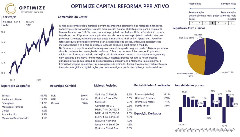 As rentabilidades divulgadas representam dados passados e não constituem uma garantia de rentabilidade futura. O valor das unidades de participação pode aumentar ou diminuir em função do nível de risco que varia entre 1 (risco mínimo) e 7 (risco máximo). Os fundos geridos pela Optimize Investimento são fundos de investimento mobiliário, cujos prospetos completos e IFI se encontram disponíveis nas entidades comercializadoras. As taxas de rentabilidade mencionadas são líquidas de comissão de gestão e de depósito, de custos de auditoria e de taxa de supervisão. Os valores divulgados têm implícita a fiscalidade suportada pelo organismo de investimento coletivo e impende sobre o investidor o eventual pagamento de impostos sobre as mais-valias. O investimento no organismo de investimento coletivo pode implicar a perda do capital investido. As medidas de rentabilidade divulgadas só seriam obtidas se o investimento fosse efetuado durante a totalidade do período de referência e têm em conta o valor da UP a 30-09-2025.