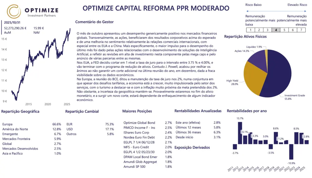 As rentabilidades divulgadas representam dados passados e não constituem uma garantia de rentabilidade futura. O valor das unidades de participação pode aumentar ou diminuir em função do nível de risco que varia entre 1 (risco mínimo) e 7 (risco máximo). Os fundos geridos pela Optimize Investimento são fundos de investimento mobiliário, cujos prospetos completos e IFI se encontram disponíveis nas entidades comercializadoras. As taxas de rentabilidade mencionadas são líquidas de comissão de gestão e de depósito, de custos de auditoria e de taxa de supervisão. Os valores divulgados têm implícita a fiscalidade suportada pelo organismo de investimento coletivo e impende sobre o investidor o eventual pagamento de impostos sobre as mais-valias. O investimento no organismo de investimento coletivo pode implicar a perda do capital investido. As medidas de rentabilidade divulgadas só seriam obtidas se o investimento fosse efetuado durante a totalidade do período de referência e têm em conta o valor da UP a 30-09-2025.